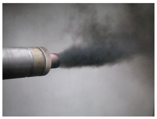 the detonation products of the main charge contain nanoscale carbon, NDC. The smaller is the value of k, the higher is the concentration of NDC in the detonation products of the main charge. The NDC escaping from the barrel (together with the gaseous detonation products) accumulates in the product collection chamber attached to the barrel. Figure 1 illustrates the emission of NDC from the barrel during the operation of the PGDD.