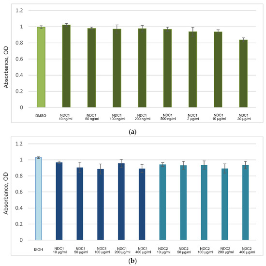 NDC effect on cell proliferation, data for different concentrations. (a) NDC1 re-suspended in DMSO. DMSO—solvent control. (b) NDC1 and NDC2 re-suspended in ethanol. EtOH—solvent control.
