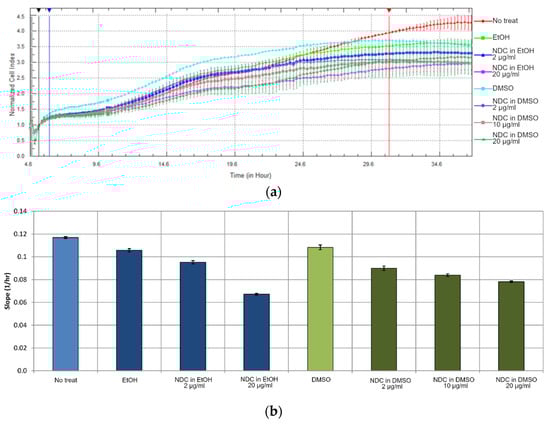 For determining the effect of NDC on the cell proliferation, we performed a real-time cell analysis using an impedance-based assay. This method allows monitoring the cell proliferation in real time by measuring the culture medium impedance in special wells covered with gold electrode stripes. The real-time cell analysis was carried out with NDC1 samples (Figure 5a).