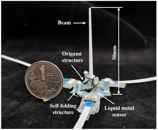 Sensor fabrication can be divided into three parts, miniature origami structure, sensing units, and self-folding units. Each part was fabricated individually and assembled, as shown in Figure 3.