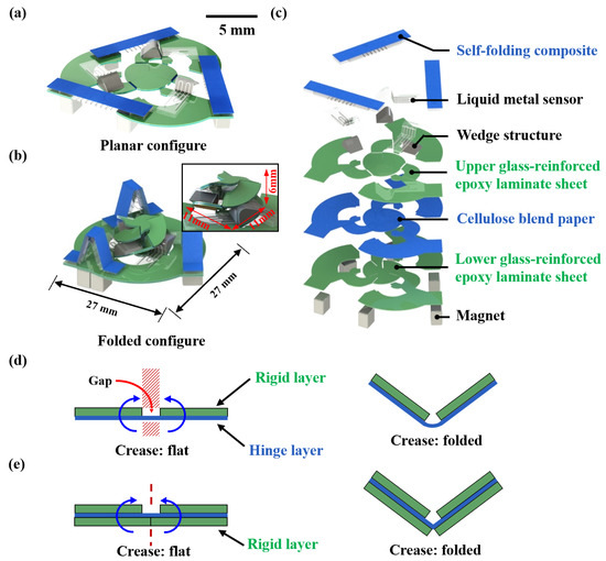 Design of the miniature soft sensor. (a) Flat state configuration. (b) Folded configuration. The inset is an enlarged view of the origami structure with the liquid metal sensor. (c) Explosion diagram of the miniature soft sensor. The self-folding composite and the liquid metal sensor’s thicknesses are 900 and 600 . The thickness of the upper and lower glass-reinforced epoxy laminate sheet and the cellulose blend paper is 200 . (d) An origami structure with a single rigid layer. The red shaded part represents the possible position of the rotating shaft. (e) An origami structure with double rigid layers.