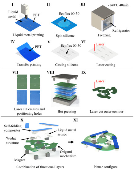 Fabrication process of the miniature soft sensor. I–VI shows the fabrication of liquid metal sensors. VII–IX shows the fabrication of the micro origami mechanism. X–XI shows the combination of each functional layer and forming of the overall structure.