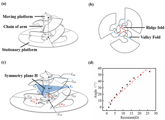 Inspired by the parallel mechanism Omni-Wrist III [39], a new three-dimensional mechanism was designed and introduced. As shown in Figure 4a,b, from a mechanism standpoint, the sensor consists of a moving platform, a stationary platform, and three chains of arms distributed equally on the circumference. Each crease can be equal to a revolute joint, and the area between two creases can equal an arm. As with Omni-Wrist III, our miniature soft sensor can rotate along two orthogonal axes. The center of the moving platform O’ can move on a spherical surface.