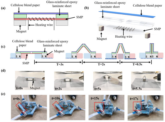 This technique used three identical self-folding units to assemble the three sectors in Figure 4b. Due to the flexibility and elasticity at the crease, the sensor can pop up from the plane state to the three-dimensional state. Figure 5a,b shows the composition of a single self-folding unit. From top to bottom, it consists of a single degree of freedom origami mechanism composed of a hinge layer and a rigid layer, a heat-sensitive sheet (Poly-Vinyl Chloride; shrinking temperature: 120 °C–150 °C thickness 300 ), a nickel-chromium alloy wire with a diameter of 100 , and two NdFeB permanent magnets with a dimension of 4 mm × 4 mm × 3 mm.