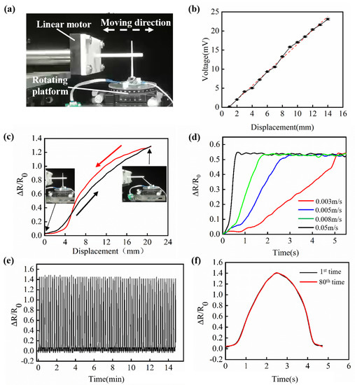 Sensor performance of the miniature soft sensor. (a) The experimental setup. (b) Linearity results from the sensor. (c) Sensor loading and unloading performance. The black line represents the sensor resistance for displacement from 0 to 22 mm, and the red line represents the sensor resistance for displacement from 22 to 0 mm. (d) Sensor dynamic response. Different color curves indicate the change of the sensor’s resistance value under different actuation speeds of the linear motor (e) A repeating test shows that the miniature soft sensor maintains high reliability after pushing and releasing 80 times. (f) Comparison of the first and the 80th resistance change curves.