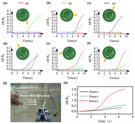 Furthermore, we tested the sensing performance underwater. As shown in Figure 7g,h, the sensor can distinguish three external flow velocities of 20 mm/s, 30 mm/s and 50 mm/s, and the slope of the signal reflected water flow velocity increasing from 0 mm/s to a steady-state velocity (20 mm/s, 30 mm/s and 50 mm/s). The flow had an impact on the upstream surface of the sensor. The faster the flow velocity, the greater the impact. The force of the flow was balanced with the restoring force generated by the deformation of the soft material and finally reached equilibrium. We tested the minimum flow rate of 20 mm/s, with the change of sensor resistance of 2.0, indicating a minimal flow rate that the sensor can accurately perceive.