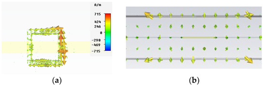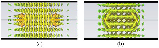 In Figure 1, the electric and magnetic fields distributions are plotted within a stripline transmission line configuration. As can be seen, a TEM mode between the input line and ground planes is excited (i.e., the E-field is axial to the ground plane). It is well known that CSRRs are excited by an electric field axial to the ring [27]. Considering this fact, the TEM mode of the stripline provides a proper excitation mode, as was already demonstrated by embedding the CSRR in the input line of a stripline in [28].