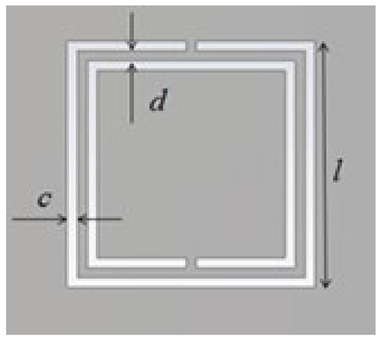The layout of the proposed device is displayed in Figure 7. The main dimensions of the SCSRR are: the length of the square side l = 4 mm, the thickness of the rings c = 0.2 mm, the distance between rings d = 0.2 mm.