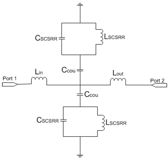 The equivalent circuit for the SCSRR follows the same approach followed to model CSRR [21], but it is adapted to a stripline, i.e., one resonator from the feedline to each ground plane. The complete circuit is depicted in Figure 5. To calculate the values of the inductance LSCSRR and capacitance CSCSRR, the equations from [22] are used. In that research, circular CSRRs are used. To make use of those equations, the perimeter of the current flow through the SCSRR has been calculated. The stripline transmission line is characterized with the per-section inductance of the stripline line [1].