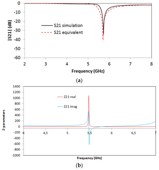 Good agreement is achieved between the simulation and the equivalent circuit, which validates previous assumptions. A resonance at f0 = 5.71 GHz is achieved, corresponding to the SCSRR resonance. There are, however, some slight differences between the results, which can be given effects such as finite circuit dimensions (which can lead to diffractive losses), non-idealities in the coupling sections (e.g., the finite length of the coupling gaps and the consideration of the edges and corners), or the effect of higher-order mode coupling in the multi-stack structure. The single resonator particle will be used in this work in order to build more complex structures. From the S-parameters, the impedance parameters are obtained. In Figure 6b, the real and imaginary parts of Z21 are represented. An abrupt change in impedance is obtained, which comes from the infinity value of the impedance and the capacitance of the resonator. It is worth noting that, in all the designs, transmission lines have been designed with a line impedance of 50 Ω, in compliance with conventional measurement port values. Given the inherent narrowband characteristics of the CSRR quasi-static resonance, impedance matching can be directly achieved, although potential requirements in line impedance could, in general, be handled by using simple λ/4 adapters or similar approaches.