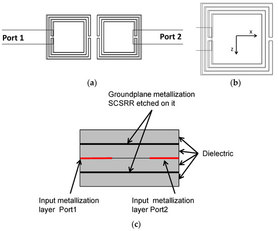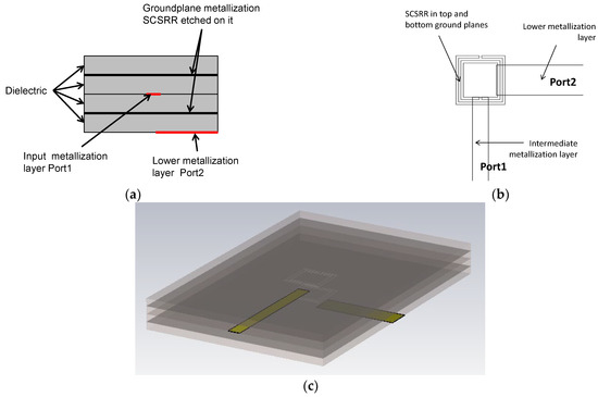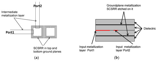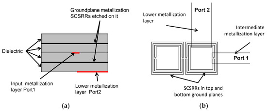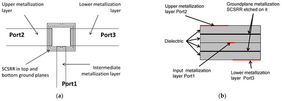 The topology of this device is as follows. The input line is the metallization of a stripline. In the middle, on each ground plane, an SCSRR is embedded. Above and below the metallization layers that form the stripline, a substrate is added on each layer. The stacked distribution is shown in Figure 11a. Finally, at the bottom layer, a new metallization line is added from the center to port 2 of the circuit, building a microstrip line, as displayed in Figure 11b. To have a clear understanding of the complete structure, a perspective view is depicted in Figure 11c. The circuit has been designed in the same substrate with an εr = 2.2 and a substrate thickness h = 0.79 mm, with the same values of SCSRR dimensions as those in the single particle described previously.