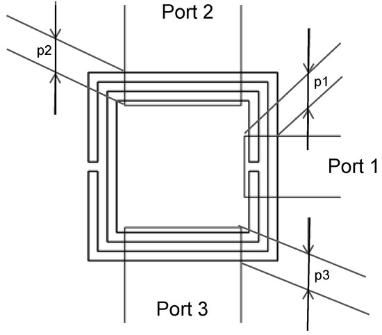 The stripline, which acts as the input, is cut as an opened stub. Both SCSRRs are placed exactly in the same position in top and bottom of this input line. The line is inserted into the rings a distance p1. In this design, the outputs are placed in each side of the rings without any gap. The currents flowing through the resonator will be coupled to the output lines, which are also designed as open stubs. The distances between the edge of the ring and the end of the output lines are p2 and p3, respectively, as pictured in Figure 8. For the power divider, the values are p1 = 0.7 mm, p2 = 0.7 mm, and p3 = 0.7 mm.