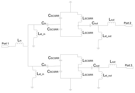 The equivalent circuit for the power divider presented above is plotted in Figure 9. The input line is characterized by the serial inductance Lin. The end of the input line is represented as an open stub Lst_in to the ground plane on each line. The next stage is the coupling from the input line to the resonators represented as Cin. The LC components of the resonator have been split in the series couples of the coupler CSCSRR and the inductance LSCSRR. Given the circuit topology, the value of CSCSRR is double that calculated from [22], whereas the inductance LSCSRR is half of the value.