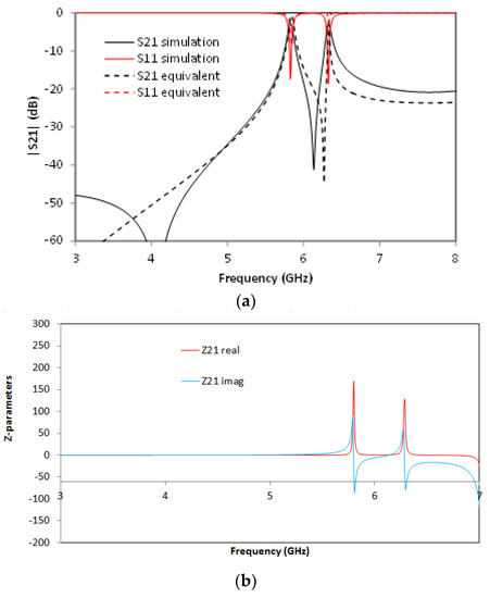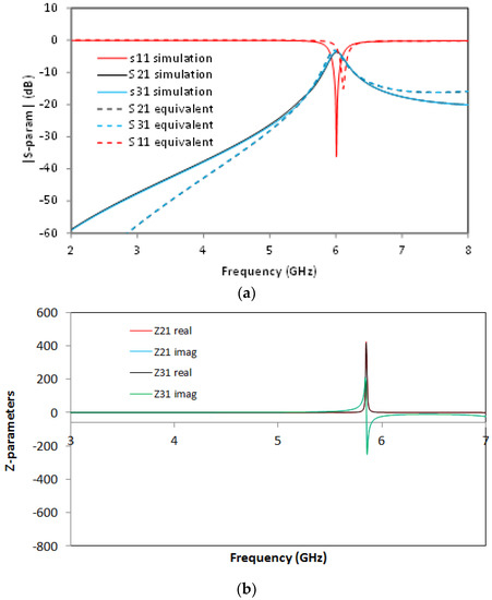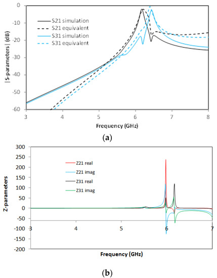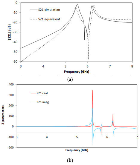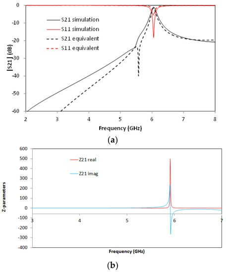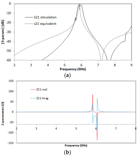 The results exhibit two resonances: the first one at f0 = 5.832 GHz, with a value of S21 = −2.87 dB, and the second one at f1 = 6.328 GHz, with a value of S21 = −2.97 dB. From the figure, two results can be highlighted. First, the ratio between the resonant frequencies f1/f0 is 1.085, which is even better than that for the previous device presented. Second, the equivalent circuit proposed matches the values of the simulated circuit with very good agreement. In the impedance graph of Figure 21b, the variation of the impedance at the resonant frequencies is achieved, once more caused by the impedance to capacitance.