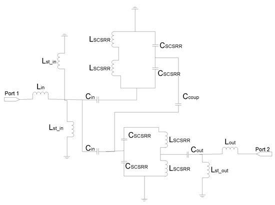 The equivalent circuit consists of the elements shown in Figure 12. The input stripline is modeled with an inductance per unit length Lin. The input line ends over the SCSRRs. This is modeled as an open stub for each ring, Lst_in. The coupling from the input line to the resonators SCSRR is modeled with capacitor Cin. The resonators are characterized by their LC tank. As the capacitance and inductance are split in two serial components, the value of LSCSRR is half of the value calculated for the resonator, and the value of CSCSRR is double the value calculated for a single resonator [22]. In this device, the ring on the top ground plane is not coupled to an output line. Coupling exists between both rings, which is represented as Ccoup. The coupling from the ring to the output microstrip line is modeled again by a capacitor Cout. As explained before, the length of the output line inserted in the SCSRR is characterized as an open stub, labeled, in this case, as Lst_out. Finally, the output line is again characterized by the inductor Lout.