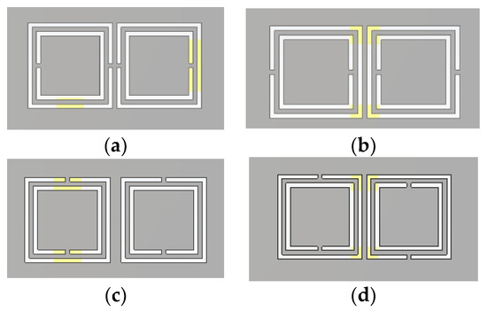 Topologies of couples of SCSRRs. (a) face-to-face, (b) back-to-back, (c) side-by-side, (d) side-by-side reversely.