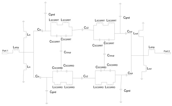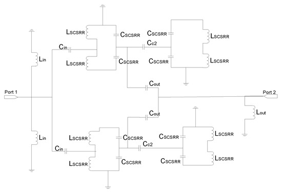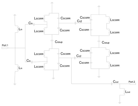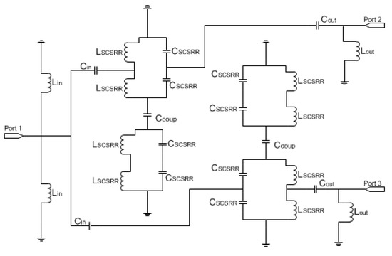 The equivalent circuit of this device explains the behavior of the circuit (see Figure 23). The end of the input stripline is emulated as an open stub characterized as an open stub Lin, as already explained in this article. The input line is coupled to the top and bottom SCSRRs. This coupling is modeled with capacitor Cin, with all the SCSRRs having the same dimensions. SCSRRs are modeled with LC tanks, and, in the figure, they are modeled in the equivalent circuit with serial couples of capacitors CSCSRR and inductors LSCSRR. It is particular for this device that the top resonator on the left side is only coupled to the resonator on the bottom layer just below it. This coupling is characterized with the capacitor Ccoup. It is worth noting that there is no coupling between the rings close to each other, a fact that has been demonstrated empirically in [48]. Finally, the SCSRR on the top is coupled with the output line on the top with the capacitor Cout, and the end of the output line is modeled as an open stub painted as inductor Lout, which is exactly the same approach as the line to port 3. The input stripline is coupled to the bottom-right SCSRR, modeled with the coupler Cin. This resonator is coupled to the SCSRR just above it, coupling Ccoup, but not to the ring in the ground plane just on its left side. Finally, energy is coupled with the output microstrip line to port 3, modeled as a coupler Cout, and the matching open stub of this output line is emulated with the inductor Lout.