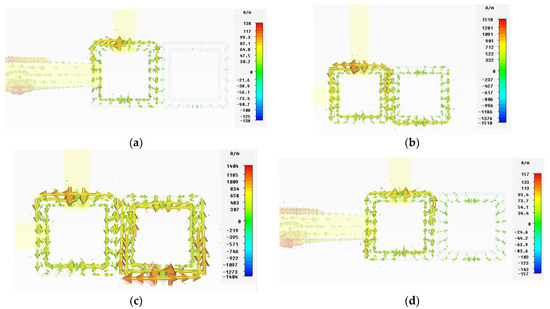 In Figure 19, it is shown how the surface current travels two different paths to the output at resonant frequencies. At 5.82 GHz, the currents flow through the perimeter of the first resonator and partly on the external ring of the second resonator. In the resonance at 6.32 GHz, the currents flow from the first resonator, they are coupled to the second, they flow through both the internal and external rings, and then they couple back to the first resonator to finally be coupled to the output line on port 2. In non-resonant frequencies, it can be seen that the SCSRRs are weakly excited; the currents flow through the ring to return to the input metallization strip (Figure 19a,d).