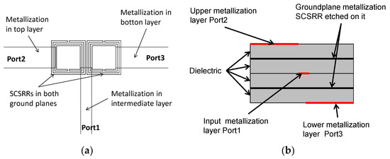 In this section, a multilayer stripline diplexer is proposed. Diplexers using composite RH/LH media were designed in microstrip technology [40,41]. It is common to exploit the use of resonant particles to build diplexers, either using non-bianisotropic resonators [42], modified Split Ring Resonators [43], or magnetically coupled resonators [44]. The use of RH/LH media in the multi-layer stage was proposed by [45], obtaining a compact device. Analytical models for multi-stage resonator diplexers were already provided [46,47]. The following device exhibits some specific characteristics. In both of the ground plane metallization layers, two SCSRRs in a side-by-side configuration are placed. The stripline acts as a feed for the device, as shown in Figure 22a. The input layer reaches the resonators just in the middle of them. The output lines are microstrip lines on the top and bottom layers and are perpendicular to the input line. The layer distribution is depicted in Figure 22b.