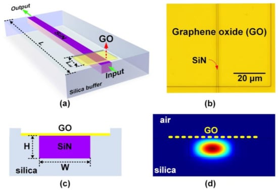 The incorporation of GO into integrated photonic devices has led to the birth of GO-based integrated photonics, which has become a very active and fast-growing field [17]. Integrated photonic devices incorporating GO films have been demonstrated for a range of applications, such as light absorbers [10,11,18], optical lenses and imaging devices [16,19,20], polarization-selective devices [8,9], sensors [21,22,23], and nonlinear optical devices [24,25,26,27,28].