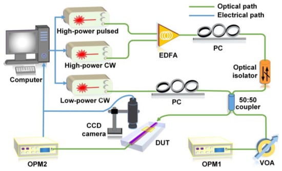 Experimental setup for characterization of PTT of GO-coated integrated waveguides. EDFA: erbium-doped fiber amplifier. PC: polarization controller. DUT: device under test. CCD: charged-coupled device. VOA: variable optical attenuator. OPM: optical power meter.