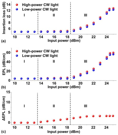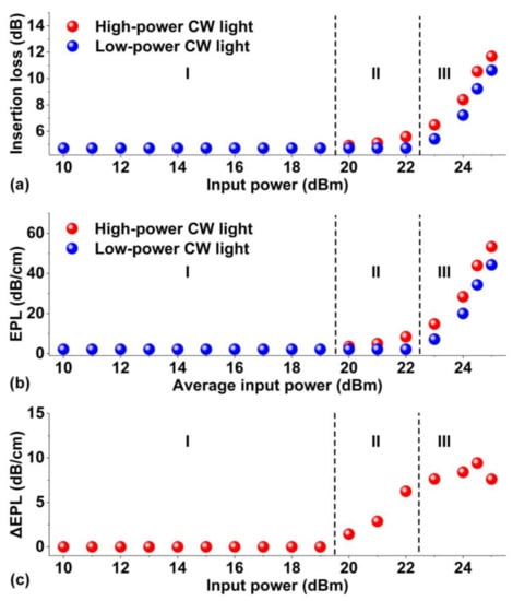 where IL is the measured insertion loss of the hybrid waveguide in Figure 3a, IL0 is the insertion loss of the bare waveguide, and Lw is the GO film length. Figure 3c shows the ΔEPL extracted from Figure 3b, which is defined as the difference between the red and blue dots after exposure by the high-power CW source at the input power indicated on the x-axis. As can be seen, the ΔEPL remained zero at Stage I, and started to increase at Stage II. In Stage III, the ΔEPL first slightly increased and then decreased when the input power was above 24 dBm. This can be attributed to the hybrid nature of GO films at this stage involving the co-existence of permanently and reversibly reduced GO.