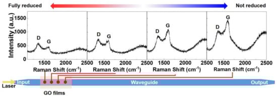 In Section 3, the inhomogeneous GO reduction along the hybrid waveguides was used to explain several experimental phenomena. To verify the inhomogeneous nature of the GO reduction induced by the photo-thermal changes, we characterized the Raman spectra of two layers of GO coated on an integrated waveguide after applying a maximum input power of 24 dBm. Micro-Raman spectroscopy (inVia Raman microspectrometer, which consisted of a Raman spectrometer integrated with a 100× objective to focus the light beam) with a spot diameter on the order of 10−6 m (close to the width of the integrated waveguide) was employed. The laser wavelength was ~514 nm. The irradiance laser intensity was on the order of 10−1 GW/cm2, which was kept the same for all measurements. The results are shown in Figure 5, where representative D and G peaks of GO can be clearly identified. Near the waveguide input, the D and G peaks of the detected Raman signals are relatively small, with a D/G ratio being larger than 1. This is similar to that of rGO [16,51,52], indicating that the GO film here was reduced. In contrast, for positions further away from the waveguide input, the D/G ratio decreased to less than 1, together with an increased intensity for the detected Raman signal. These characteristics show agreement with Raman spectra of GO having fewer defects [13,53,54] and reflect the fact that the GO away from the waveguide input was reduced less. According to our previous measurements [16], only fully reduced GO (with its material properties close to graphene) shows an obvious 2D peak in the Raman spectrum, whereas GO and partially reduced GO do not show obvious 2D peaks. For the Raman spectra in Figure 5, no obvious 2D peaks were observed. Therefore, we infer that the GO film coated on the integrated waveguide was not fully reduced despite the fact that there were permanent changes in its properties.