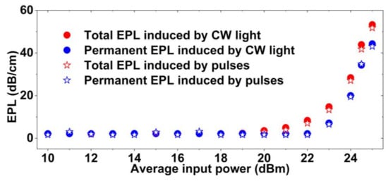 To compare the PTT induced by CW light versus optical pulses, we measured the EPLs of the hybrid waveguides with a single GO layer for both CW light and optical pulses having the same average power. The results are shown in Figure 6. The optical pulses had a repetition rate of ~60 MHz and a pulse width of ~3.7 ps, which corresponded to a peak power 4 × 103 times higher than the CW light with the same average power. As can be seen, both the CW light and the optical pulses induced measurable EPLs at high average input powers. The small difference between them indicates that the EPL was mainly a function of the average power rather than peak power. This is in agreement with observations in GO films arising from photo-thermal processes in previous works [24,37,38], and further confirms the existence of the photo thermal changes. In contrast, the changes induced by ultrafast nonlinear optical processes such as four-wave mixing, two-photon absorption, and saturable absorption are dependent on the peak input light power [40,55,56,57,58,59]. The slightly lower EPL induced by optical pulses compared to CW light can be attributed to saturable absorption in the GO films caused by the high peak powers, which was also observed in previous works [25,28,39]. We also measured permanent EPLs at low-power CW light (0 dBm) after turning off the high-power CW light and optical pulses. The permanent EPLs induced by the CW and optical pulses showed negligible difference, reflecting the fact that the permanent reduction of GO was mainly induced by the photo-thermal changes. Since the pulsed laser source used in our measurements only had fixed pulse width and period, we did not investigate the photo-thermal changes induced by optical pulses with different widths and periods, which is interesting and could be the subject of future work.