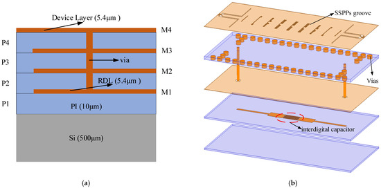 This work adopts a redistribution layer (RDL) process whose stack-up is illustrated in Figure 1a. All circuit structures are designed in a four-layer dielectric system interconnected by through-dielectric vias (TDV). The material of the dielectric layer is polyimide (PI-HD4100) with a relative permittivity of 3.2. As shown in Figure 1b, two dielectric layers (P3, P4) are utilized as the SIW cavity. The device layer (M4) is employed to etch the SSPPs grooves and M2 is used as a ground plane. The M1 layer is used to design interdigital capacitors. The low-cutoff frequency is determined by the size of the SIW cavity, and the high-cutoff is finally acquired from the dispersion curve of the SSPPs. All electromagnetic (EM) simulations were carried out using the finite-element method (FEM) of the HFSS 3D simulator.