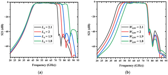 To confirm the passband alteration characteristics of the proposed filter, a parameter inquiry was conducted. The simulated results of transmission coefficients are demonstrated in Figure 5 with different geometric parameters. It can be inferred that the high-cutoff frequency of the proposed filter is determined by the SSPPs length , and the low-cutoff frequency is determined by the SIW width . Figure 5a shows that when the value of increases gradually, the upper sideband frequency of the filter will move to the left, while the lower sideband remains constant; the bandwidth becomes narrower accordingly. It can be attributed to the gradual increase of the propagation constant and momentum, and the decrease of the asymptotic frequency, with the increase of the geometric length of the curved slot. In addition, as shown in Figure 5b, the decreases and the lower sideband shifts to the right because the resonant frequency of the SIW is determined by the SIW width . Therefore, the bandwidth of the filter can be flexibly controlled by adjusting the size of the SIW cavity and the SSPP slot. Finally, the dimensions of the BPF are determined by the low-cutoff frequency (47 GHz) and high-cutoff frequency (74 GHz), as shown in Table 2.