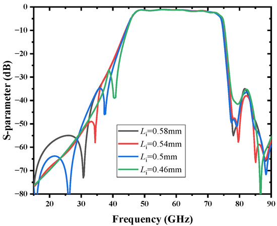 The capacitance of the interdigital capacitor will change over . By adjusting the capacitance of the interdigital capacitor, the location of the TZ is moved, as shown in Figure 11, and the suppression deteriorates as TZ approaches the passband. To optimize the performance of the filter, a transmission zero is finally generated at 37.92 GHz, and the height of the through dielectric via 0.0246 mm and the radius of the via 0.04 mm are finally determined.