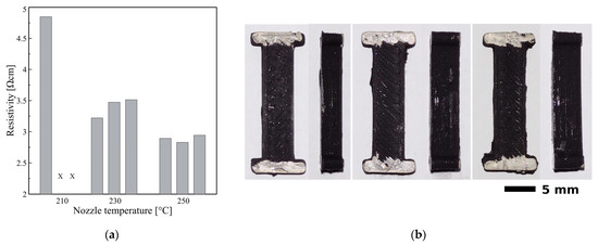 Results from the experiments concerning influence of the printing temperature on the quality and resistivity of the samples for temperature values 210 °C, 230 °C and 250 °C. (a) Resistivity values for beams printed with different nozzle temperatures—“X” mark inform about failure due to the nozzle clogging; (b) Images of sample beams printed with different nozzle temperatures (from left): 210 °C, 230 °C and 250 °C, respectively.