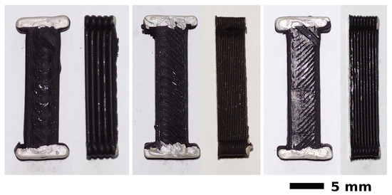 The beams were printed with a 100% fill level and a linear fill pattern, with the path printing angle 45° and −45° to the direction of current flow (Figure 1b). This fill pattern compromises sufficient mechanical strength and the lowest possible resistance [17].