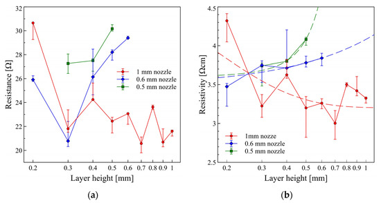 (a) Results of the resistance measurements of the samples printed with nozzle diameters from 0.5 to 1 mm, and wide range of layer thickness. (b) Calculated resistivity values for the same samples.