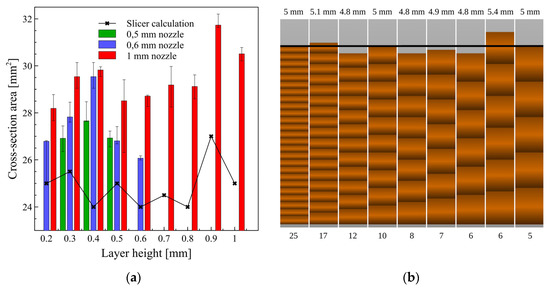 (a) Geometry measurements (cross-section areas) of the samples printed with nozzle diameters from 0.5 to 1 mm, and a wide layer thickness range. (b) Comparison of the samples generated by slicer with 5 mm height set as the initial value (black line)—upper values correspond to the calculated height as a multiplication of layer thickness, and bottom values correspond to the number of generated layers, respectively.