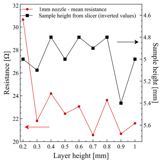 Mentioned fluctuations in the sample cross-sections significantly influence printed samples’ resistance. Due to a large number of data for the 1 mm nozzle printouts, it is best to analyse such phenomenon only for these samples. Initially, we could attribute resistance fluctuations to the quality of the printed samples—simple and most common approach. This is true for samples with lower layer thickness, regardless of the nozzle diameter. As mentioned previously, for 0.5 mm nozzle diameter, it was only possible to obtain samples at a layer height equal to or above 0.3 mm—for 0.2 mm nozzle was clogged. Figure 4 shows similar negative results for 0.6 and 1 mm nozzle, with significantly high resistance values. Analysing results for a 1 mm nozzle more closely allows observing a trend in resistance change for roughly stabilized values obtained for 0.3 to 1 mm layer height. In Figure 6, a comparison of resistance values and sample height generated from the slicer software is presented—the sample height plot was intentionally inverted for better visualization of correlation. Keeping in mind that the resistance value will decrease with a larger sample height, we observe a direct correlation between these two values. Black colour points represent sample height values calculated by the slicer software as a multiplication of layer thickness and the number of generated layers. Besides results for 0.2 mm layer thickness, there is a straightforward correlation for remaining values of resistance and sample height—resistance decreases for thicker samples and resistance increases for thinner samples, respectively. This initially obvious observation that the resistance value drops with larger sample height (cross-section) is not so obvious taking into account that the designed geometry of the sample will be modified by the slicer without any information to the user and might significantly affect the working parameters and efficiency of the electronic systems.