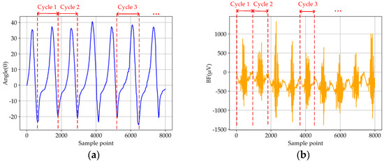 - According to the data repeatability, the IMU and EMG sensors were fixed on the lower limbs under the same conditions in one test. Then, the data illustrate the periodical variations (partial data of IMU and EMG sensors are shown in Figure 4a,b). Therefore, the similarity coefficients between the five random cycles test data of each IMU signal were calculated by using the Pearson correlation, which were higher than 0.87. Next, the fluctuation of the average value of iEMG (integrated EMG) showed a slight oscillation, which the average value and standard deviation of RF, TA, BF, and GA are 188.609 ± 3.109, 127.313 ± 2.050, 262.253 ± 3.948 and 459.762 ± 3.274, respectively. To sum up, the results indicate that the data of five random cycles with each signal presented preferable similarity and repeatability.