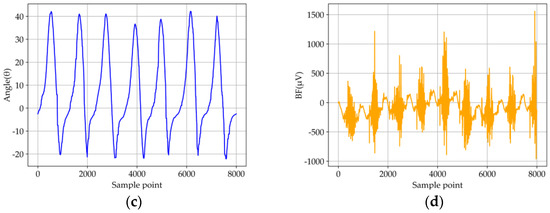 Parts of the test data obtained from the first and second groups of running mode tests. (a) Angle signal by IMU in the first group test; (b) EMG signal of BF in the first group test; (c) angle signal by IMU in the second group test; (d) EMG signal of BF in the second group test.
