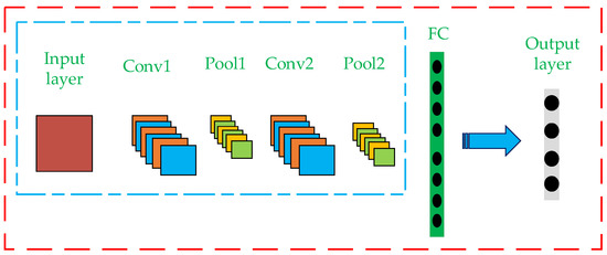 In recent years, CNN, an artificial intelligence algorithm, has become a hot research topic in many fields, especially in image classification. Traditional CNN classification is generally based on the structure of single stream CNN, whose model structure mainly includes the convolution layer (Conv), pooling layer (Pool), full connection layer (FC) and output layer, as shown in Figure 5. The convolution layer performs convolution operation on the input image, extracts the image features, and then outputs the convolution results by forming feature mapping through activation function. The Pooling layer is also called the down-sampling layer, whose purpose is to compress the feature graph obtained by Convolution layer, so as to optimize the computational efficiency of the model. The full connection layer maps the distributed feature representation obtained through the convolution layer and pooling layer to the sample tag space. Finally, the softmax function is applied in the output layer to export the classification results, and the error between the results and the real classification results is calculated and the weight and paranoid value are updated by back propagation.