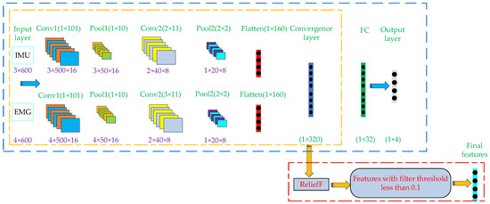 The dual Stream CNN recognition model is improved based on Single Stream CNN and is widely used in video action recognition [27]. The main idea is to send RGB images (representing spatial information) and optical flow images (representing temporal information) to two neural networks for feature extraction, fuse the extracted features, and finally output the classification results. Based on the above ideas, the authors designed a Dual Stream CNN feature extractor based on multiple timing information fusion. The basic principle of the extractor can be specifically described as follows: First, a complete Dual Stream CNN recognition model is built (whose structure is shown in the blue-line box in Figure 6). IMU and EMG signals were input into the model to carry out convolution and pooling operations, respectively, and two eigenvalues were obtained. Then, the two eigenvalues are fused at the convergence layer and calculated at the full connection layer. Finally, the fusion features after operation are transferred to the output layer to export the classification results. In this process, the parameters of each layer in the model are determined and retained through continuous iteration and updating of weights and deviations by back propagation algorithm. According to the loss rate and accuracy rate, the training state of the current model is judged and the excess number is adjusted in time. Finally, the batch size of the training model was set as 64, the learning rate was 0.001, and the number of iterations was 200. Use ReLu function as activation function of each convolution layer. The cross-entropy loss function is used to measure the gap between the predicted result and the actual result. The above process is the training process of Dual Stream CNN recognition model. Then, the output layer in the trained Dual Stream CNN recognition model is removed, and the remaining network structure is used to extract data features (that is, a feature extractor only used for feature extraction is formed; its structure is shown in the yellow-line box in Figure 6). In this way, the feature extractor can be used to extract fusion features from the data set composed of IMU and EMG. In this process, the feature extractor can perform in-depth feature re-mining for the two different time series information and, finally, extract well differentiated fusion features. However, the features extracted by Dual Stream CNN model still have too high data dimensions. For motion pattern recognition, when the feature dimension of the data sample is high, two aspects will be affected. First, the feature dimension is high, which will cause redundancy among features, affecting the recognition accuracy. Second, the increase of feature dimension will greatly prolong the time of model training. Therefore, it is necessary to reduce the dimension of extracted features. ReliefF is a heuristic search filter method generated by Kononenko [28] based on Kira’s work, which can process incomplete data and solve noisy multi-classification and regression problems [29,30]. At the same time, ReliefF provides feature selection with high search accuracy and efficiency. Therefore, the ReliefF feature selection method was introduced to eliminate redundant features in the initial feature set extracted by Dual Stream CNN so as to reduce the dimension of features, thus improving the classification accuracy of the model and reducing the training time of the model. The processing flow of ReliefF algorithm for feature selection is as follows: