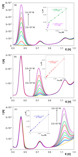 - Salamanca-Neto, C.A.R.; Marcheafave, G.G.; Mattos, G.J.; Moraes, J.T.; Schwarzova-Peckova, K.; Sartori, E.R. Boron-doped diamond film and multiple linear regression-based calibration applied to the simultaneous electrochemical determination of paracetamol, phenylephrine hydrochloride, and loratadine in fixed-dose combinations. Microchem. J. 2021, 162, 105831. [Google Scholar] [CrossRef]
