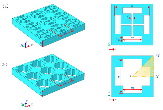 DIH-PnC structure: (a) DIH-PnC structure, (b) cross-like holey PnC structure. The right side is a single cell.