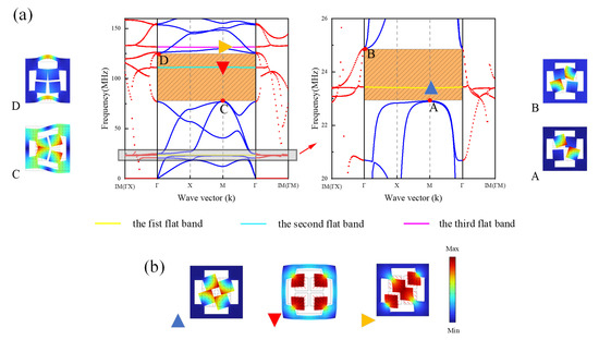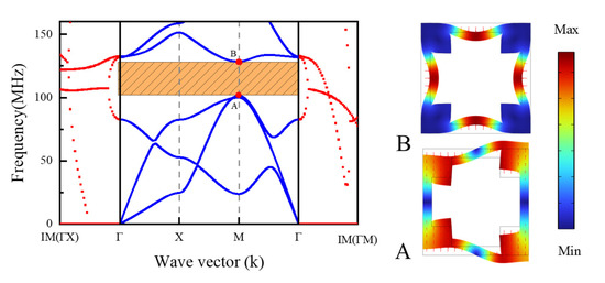 When the inner hole width is and , the complex energy band diagram of the DIH-PnC structure is shown in Figure 2a. For the convenience of viewing, the complex energy band within 20–26 MHz is partially enlarged. The solid blue line and the red dotted line represent the real wave vector energy band curve and the imaginary wave vector attenuation curve of the wave vector K, respectively. The right side of Figure 2a shows the mode shape diagram of the special point of the first band gap boundary, and the left side of Figure 2a shows the mode shape diagram of the special point of the second band gap boundary. It can be seen from the complex energy band curve in Figure 2a that there were two complete band gaps in the frequency range of 0–160 MHz, of which the first band gap was at 22.9−24.9 MHz and the second was at 77.6–125.1 MHz. It is worth noting that there was a flat band in the two band gap ranges and a third flat band appeared at 131.5 MHz. The special point mode shape of the flat band is shown in Figure 2b. When the structure is known to be at the natural frequency of the local resonance, the virtual wave vector decay curve exhibits obvious sharp features [31]. Combining with the attenuation curve of the virtual wave vector where the flat band is located in Figure 2, it could be known that the flat band is caused by the first natural frequency, the second natural frequency, and the third natural frequency of the four mass blocks. It can be seen from the special point mode shapes of A/B in Figure 2 that the first band gap boundary mode shapes all show the torsional local resonance mode of the diagonal mass block, and opening the first band gap was the local resonance band gap: 22.9−24.9 MHz.