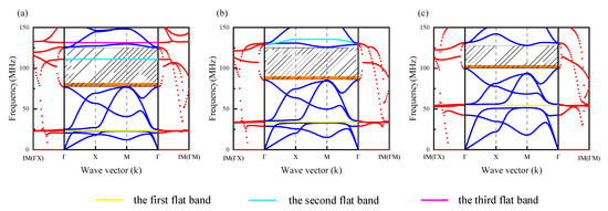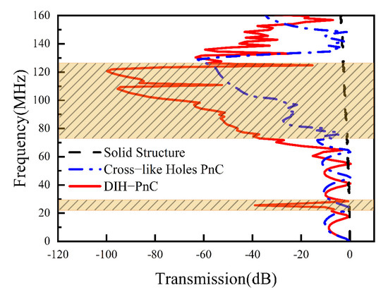 It can be seen from Figure 7 that when , the second band gap of the DIH-PnC structure was 77.6–125.1 MHz. When , the second band gap of the DIH-PnC structure: 85.3–125.0 MHz. When , the second band gap of the DIH-PnC structure: 94.1–128 MHz.