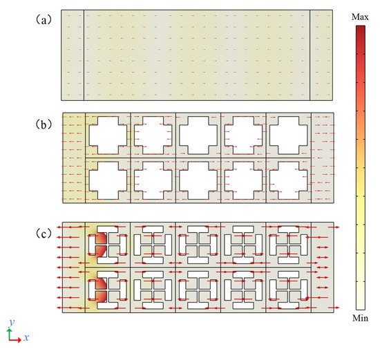 To further analyze the stop band situation within 75–125 MHz, the normalized displacement field of different delay lines at the same frequency of 108 MHz is plotted using a heat map (as shown in Figure 6); red indicates maximum displacement, white indicates no movement, and arrows indicate the direction of displacement at each point. Figure 6a shows the normalized displacement field of the solid contrast delay line, Figure 6b is the normalized displacement field of the cross-like holey PnC delay line, and Figure 6c is the normalized displacement field of the delay line of the DIH-PnC structure. It can be seen from the figure that when the frequency was at 108 MHz, the normalized displacement field of the cross-like holey PnC delay line gradually weakened as the elastic wave propagated in the x-direction. When the frequency was at 108 MHz, the DIH-PnC structure delay line not only had the normalized displacement field but gradually weakened as the elastic wave propagated in the x-direction. At the same time, a large number of elastic waves were blocked on the left side of the first column of DIH-PnC unit cells due to the local resonance of the internal mass. It was further verified that the second band gap of the DIH-PnC structure is based on the coupling mechanism of Bragg and local resonance.