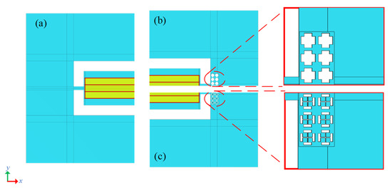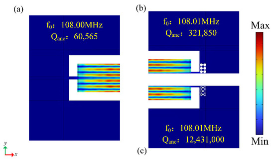 In order to verify the effect of the DIH-PnC resonator on anchor loss, we established a comparative analysis of different types of resonators. A conventional resonator is shown in Figure 9a, Figure 9b is a resonator using the cross-like holey PnC shown in Figure 3, and Figure 9c is a resonator using the DIH-PnC shown in Figure 2. Among them, a PnC array with six rows and two columns was used on the substrate.