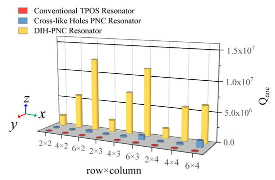 It can be seen from Figure 11 that the of the DIH-PnC resonator was much higher than that of the conventional resonator and the cross-like holey PnC resonator. For DIH-PnC resonators, did not increase with the number of periodic arrays. When the PnC array was in six rows × two columns, the of the DIH-PnC resonator reached a maximum value of 1.24 × 107. For the cross-like holey PnC resonator, gradually increased with the increase in the number of periodic arrays. When the PnC array was six rows × four columns, the of the cross-hole PnC resonator reached the maximum value of 1.12 × 106. However, if the of the resonator reached 1.12 × 106, the DIH-PnC resonator only needed to use a two rows × two columns PnC periodic array, and the periodic array number was only 1/6 compared with the cross-like holey PnC.