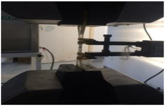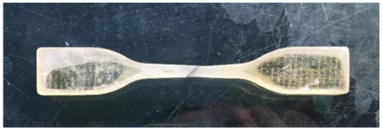 In the middle of the resin stretching spline die, a slot is opened, the fiber tow is laid perpendicular to the direction of the sample stretching, and the transverse tow stretching sample prepared by co-curing after pouring resin is stretched to fracture under uniform loading of the appropriate mechanical device [21]. Tensile strength, modulus of elasticity, and strain at maximum load are calculated according to the tensile stress–strain curve. Previous studies have shown that the tensile strength of transverse tow tensile specimens can reflect the strength of the fiber/resin–interface bonding. The transversal damage has been particularly studied in one of the recent studies of the author. The tested specimens are shown in Figure 5.