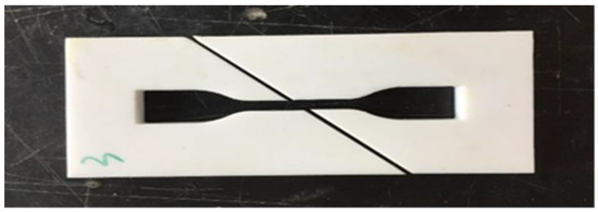 The interfacial shear tow tension specimen prepared by co-curing after pouring resin is stretched to fracture under uniform loading of the appropriate mechanical device. According to the tensile stress–strain curve, the interfacial shear strength and shear elastic modulus are calculated. Dimension design of tensile specimens of oblique 450 fiber arrangements refers to the standard sample size recommended by ASTM D638 [22] processed through Northwestern Polytechnical University, China. Along the symmetrical center line of the resin casting die, the die is cut diagonally 450 to lay the fiber arrangements. The other methods of operation are the same as those of transverse fiber tow tensile specimens. The drawing sample die is shown in Figure 6. The final curing and polishing of qualified resin matrix splines are shown in Figure 7.