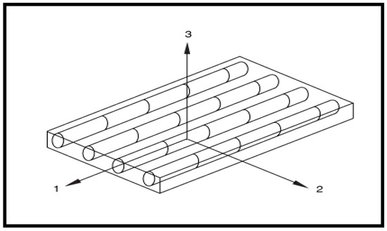 In Equation (8) , is the current state of fiber damage, is the current state of matrix damage, is the current state of shear damage, is the Young’s modulus in fiber direction (longitudinal direction), is the Young’s modulus in the direction perpendicular to the fibers (transverse direction), G12 is the shear Modulus and , and are Poisson ratios. The longitudinal and transverse direction of uni-directional lamina is shown in Figure 8 as direction 1 and 2, respectively.